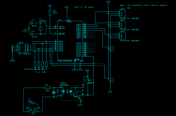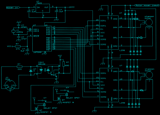 The first circuit was the MIDI to servomotor interface. Except for the program of the PIC (Programmable Integrated Circuit) you can buy everything in a good assorted electronics store. The second circuit, the MIDI to stepper motor interface was much more difficult to build, especially since it was built onto the same circuit board as the servomotor controller. Since it has a shared power supply and ground, a small mistake makes both the circuits defective and errors are hard to detect.