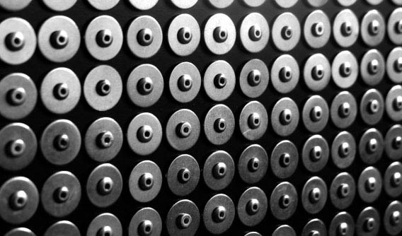 The pins on the Digital Pin Display are made of aluminium with zinc-plated rings and the top layer of the display plate in which they are mounted is made of black HPL (High Pressure Laminate) from ARPA, Italy. This appeared to be a very good combination since a lot of the dark in the 3D images is coming from the black plate and the reflection of this plate in the pins.